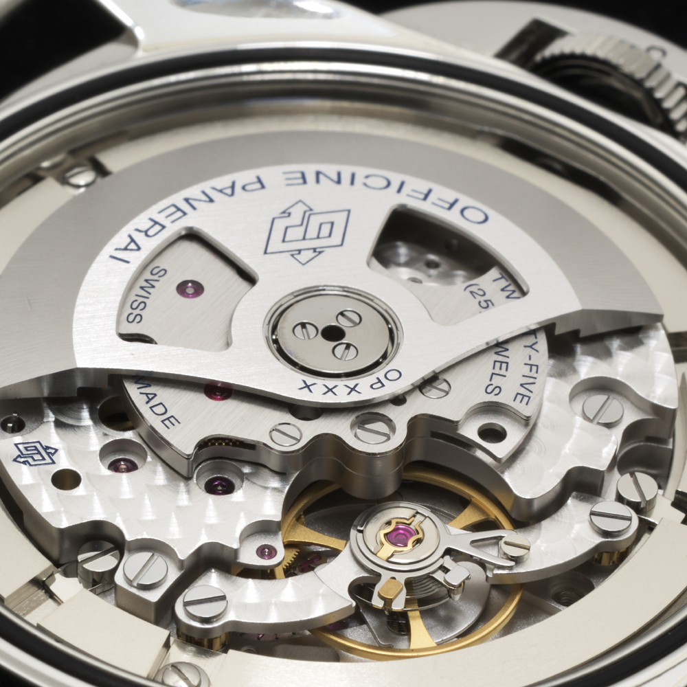*現在パネライのムーブメントの番号はPから始まるものがほとんどで、おそらく自社ムーブメントであることを意味しているものと思われます。このモデルに使われているムーブメントはOPXXXで以前のパネライムーブメントのような雰囲気の番号となっています。現行製品でOPから始まる番号のムーブメントはOPXXXだけかもしれません。ムーブメントの地板にETAやセリタ等の刻印はないのですが、どこかで見たことがあるような、ないような雰囲気のムーブメントです。ベースムーブメントをチューンナップしたものなのでしょうか。パネライの自社ムーブメントはフリースプラング緩急調整方式が多いのですが、このムーブメントは緩急針による調整方式です。テンプ付近はETAによく似ています。ETAの特許切れの機構(エタクロン)が搭載されています。エタクロンはセイコーの一部のムーブメントにも搭載されていますので、コストと性能のバランスに優れた機構なのだと思います。CAL.OPXXXはある程度コスト面も重視したムーブメントということになると思います。以前のETA7750ベースと比べてみた場合、リューズの操作感は高級感が感じられるようになったと思います。時刻合わせ時の感触はしっとりした感じで、手でゼンマイを巻いた時の感触もよく小気味よい音がします。