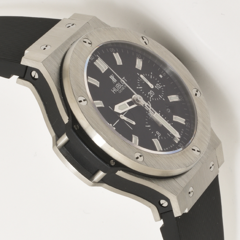 - *小キズも少なく、使用感も少ない印象の、かなりきれいな中古です。前オーナーが2020年4月にメーカーコンプリートサービスを行なっています。内容は(クロノグラフ針、プッシュボタンインサート、プッシュボタン、コンプリートサービス06、外装仕上げ 追加作業)です。特記事項欄に「限定修理、保証外(不具合ご了承、リューズ交換省く)」とのコメントがあります。なぜリューズ交換だけ行わなかったのかは、よく分かりませんが、当店にてリューズ交換をメーカーに依頼しました。従いまして「限定修理、保証外(不具合ご了承、リューズ交換省く)」の状態ではなくなったのですが、メーカー修理保証期間は1年ですので、保証修理は既に終了です。明細の「お預かり時の状態」欄で外装打痕有り、ガラスコーティング キズ、バンド ヒビ、プッシュボタン4時位置緩み/取れ 機械内部鉄粉混入 他のコメントがあります。裏蓋に小さな打痕がありますが、中古品として気にするほどのダメージではありません。コーティングのキズは分かりませんでした。とるに足らないほどのコーティングのキズ、または交換等何らかの対応が行われたかのどちらかだと思います。メーカーのコメント欄にも記載はありませんが、ガラス自体にキズはありません。純正ラバーベルトは、使用感の少ない綺麗な状態なのですが、ラグ付近に表面的な劣化が見られます。破損につながるようなものではなくよく見ないと分かりませんので実用上は差し支えないと思います。