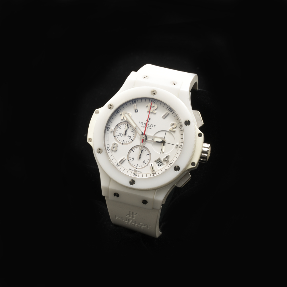 - *セラミック部分にキズはありません。それ以外は多少の小キズが見られますが、きれいな中古です。白いウブロの中古は黄ばみが気になるところですが、十分に許容範囲内だと思います。多少黄ばみが見られる程度です。*サファイアガラス風防に気になるようなキズはありません。反射光とルーペで観察しますと、表面にスジのようなものが多少見られますが、爪で引っかかる感じはなく、コーティングの傷みなのか、ごく表面的なスクラッチキズなのかは判断が難しいところです。コーティングの傷みの場合、光の具合によっては見苦しいことがありますが、この個体の場合はそのようなことはありません。*純正ラバーベルトは多少使用感が見られます。