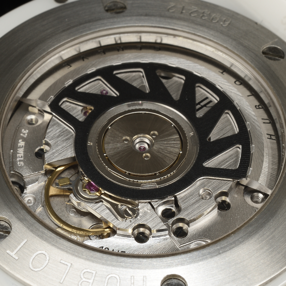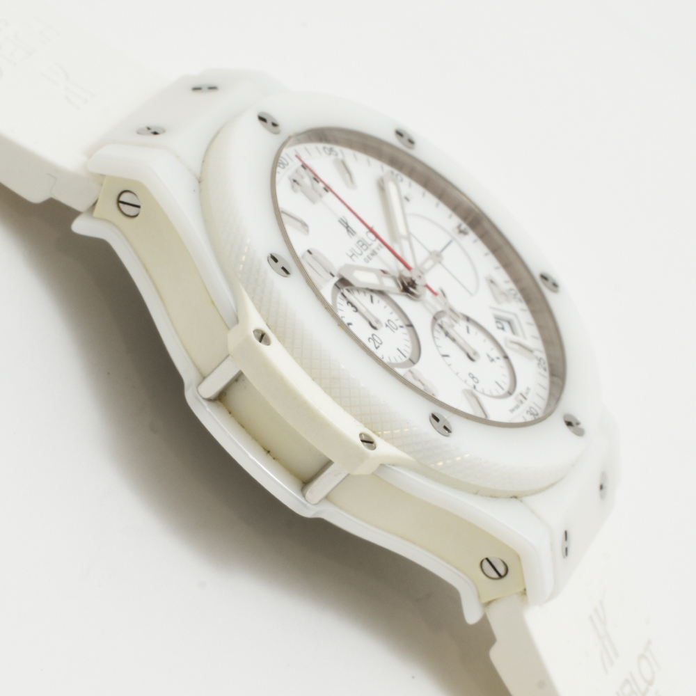 - *セラミック部分にキズはありません。それ以外は多少の小キズが見られますが、きれいな中古です。白いウブロの中古は黄ばみが気になるところですが、十分に許容範囲内だと思います。多少黄ばみが見られる程度です。*サファイアガラス風防に気になるようなキズはありません。反射光とルーペで観察しますと、表面にスジのようなものが多少見られますが、爪で引っかかる感じはなく、コーティングの傷みなのか、ごく表面的なスクラッチキズなのかは判断が難しいところです。コーティングの傷みの場合、光の具合によっては見苦しいことがありますが、この個体の場合はそのようなことはありません。*純正ラバーベルトは多少使用感が見られます。